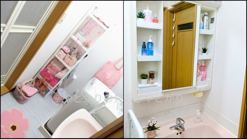 また、画像にはほぼ写っていませんが、以前から使用していたドライヤーも白とピンクで(レールベリの下段にかけてあります)、ヘアアイロンは購入する際にピンクを指定したため、洗面所で使用する家電もほぼ色縛りに収まっています。