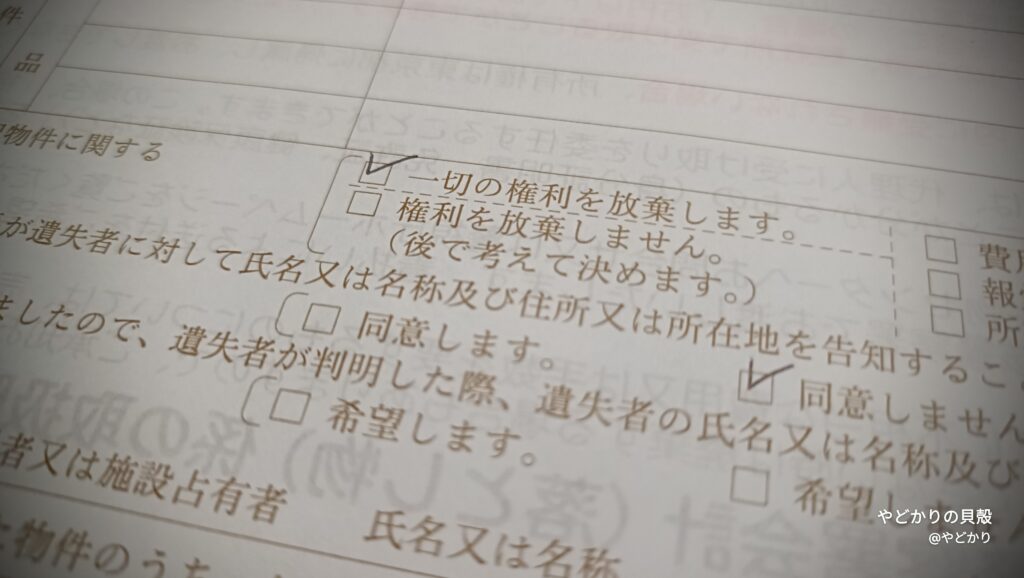 拾ったときの状況や場所などを聞かれて答えていくと、最後に権利についてはどうするかという話になりました。