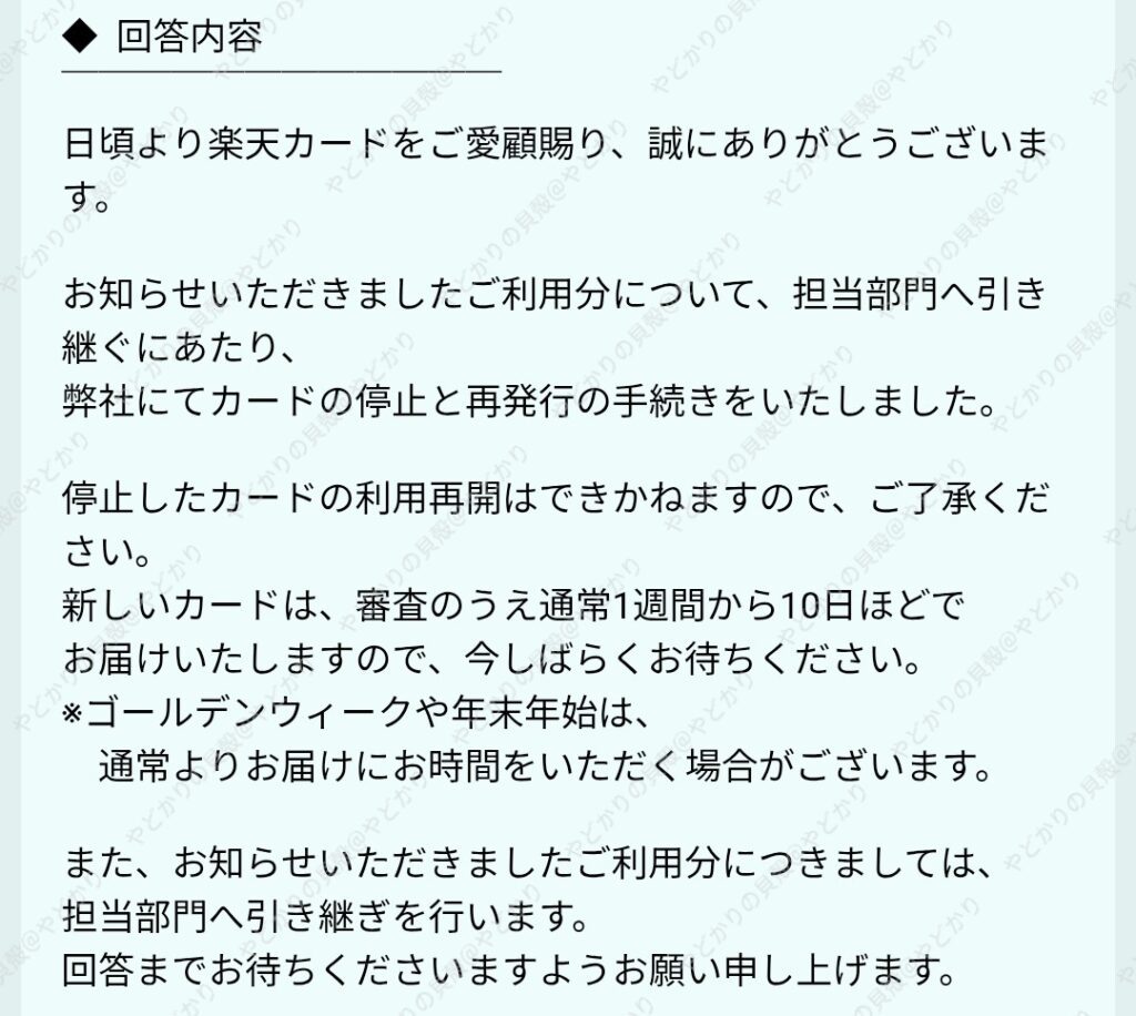 「お知らせいただきましたご利用分について、担当部門へ引き継ぐにあたり、弊社にてカードの停止と再発行の手続きをいたしました。」